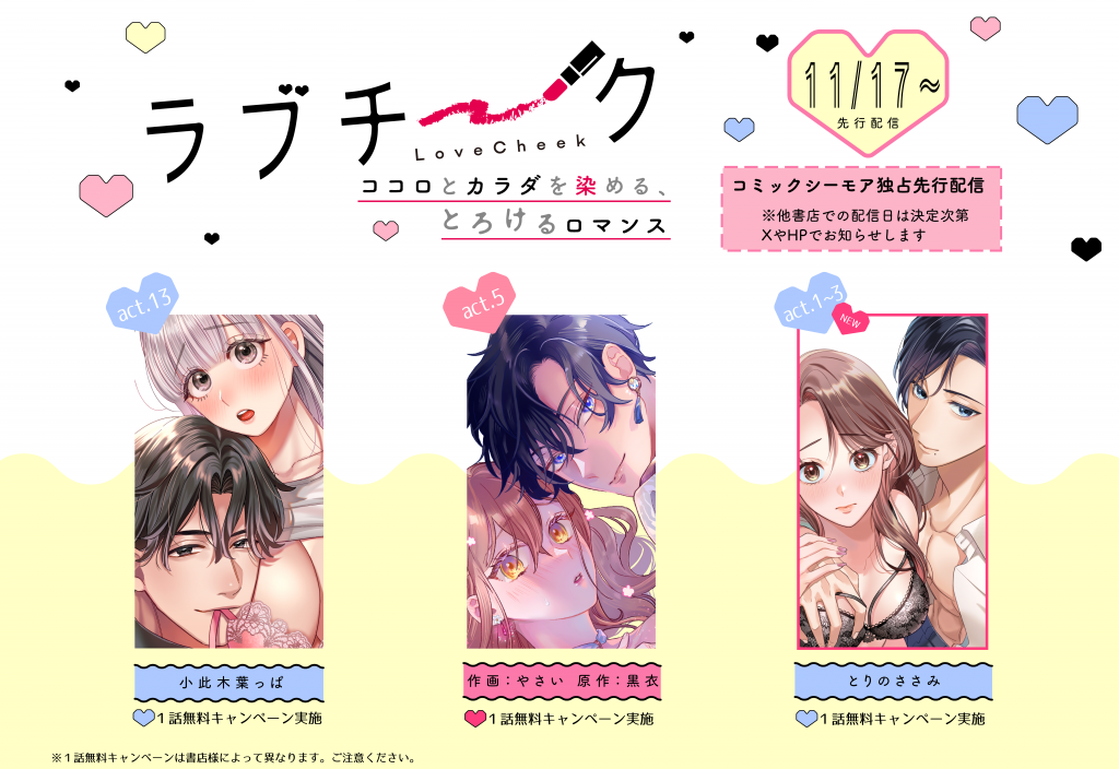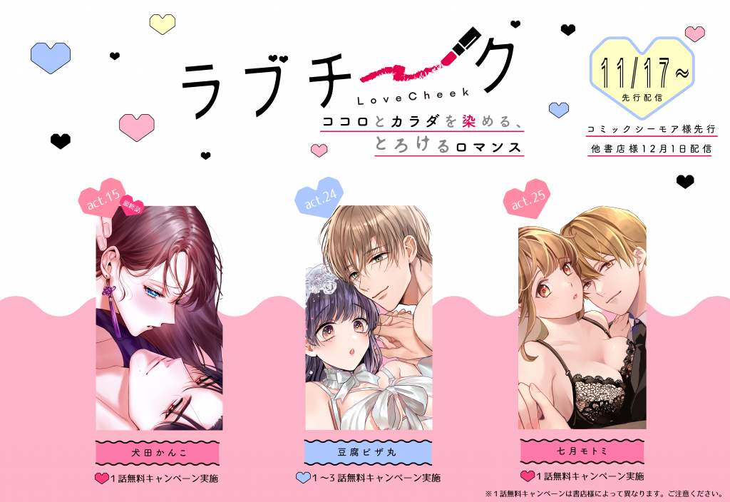 💎11月先行配信について💎 2025.11.10 💎 配信のお知らせ💎 11月17日~⑥作品 コミックシーモア様 先行配信 🌟最終回🌟■極妻はお断り~クザの若頭に溺愛される1ヶ月~act.15 🌟新連載🌟■春宮さんは夜もデキる~鬼上司は私の専属セラピスト~act.1〜act.3 ■隠れてないで出ておいで~執着系元カレにトラウマ乳首を狙われてます~act.24 ■そんな顔して、誘ってる? 〜溺愛社長と身代わりお見合い結婚!?〜act.25 ■ドS社長はドM秘書をいじめたい ~オフィスでぬれとろ玩具レビュー~act.13 ■エッチな倫理観の壊れた世界で溺愛魔術師から逃げられない ~転生悪役令嬢フィリエラの困惑~act.5 Tweet Share +1 NEWS 関連記事一覧 NEWS 💎6月先行配信について💎 2025.06.05 DIGITAL きみは世界でひとりのオメガ 2021.02.02 COMICS ギャルと社畜 2022.05.27 COMICS 転生魔女は竜族の魔物様に囲われます 上・下 2023.06.12 COMICS 政略結婚のお世継ぎ事情 2025.02.20 NEWS 💎8月全書店配信について💎 2025.07.24 DIGITAL 君の中を泳ぎたい 2022.05.10 NEWS ★8月配信について★ 2020.07.21